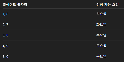 출생연도 끝자리에 따라 신청 요일이 정해지는 요일제가 시행되므로, 아래 표를 참고해 주세요.