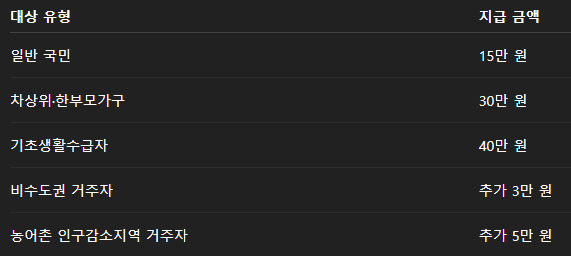 기본적으로 1인당 15만 원이 지급되며, 다음과 같은 조건에 따라 추가 금액이 붙습니다.